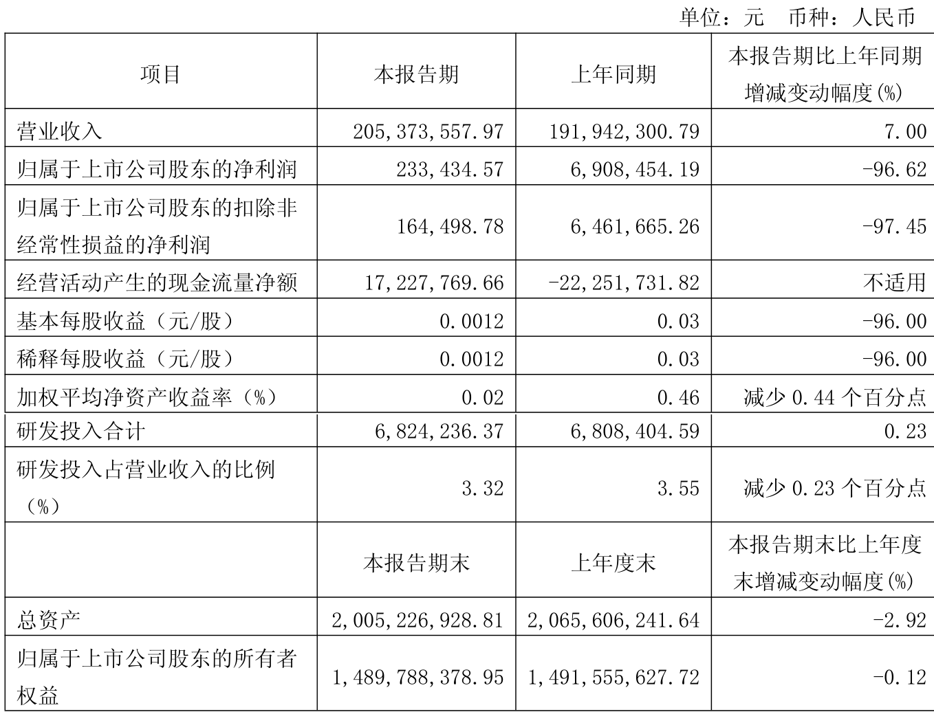 中证智能财讯海正生材(688203)4月26日披露2025年第一季度报告。公司实现营业总收入2.05亿元,同比增长7.00%;归母净利润23.34万元,同比下降96.62%;扣非净利润16.45万元,同比下降97.45%;经营活动产生的现金流量净额为1722.78万元,上年同期为-2225.17万元;报告期内,海正生材基本每股收益为0.0012元,加权平均净资产收益率为0.02%。