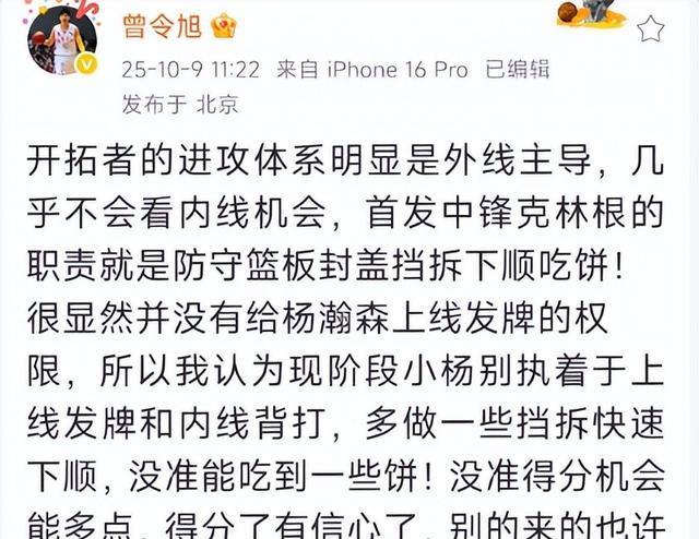 专家曾令旭看过本场比赛后直接发表自己的观点,他表示杨瀚森的整体速率太慢了,NBA的节奏很快,目前来看,杨瀚森还是跟不上NBA的攻防节奏,而且曾指导表示,开拓者的进攻体系还是以外线为主,导内线球员很少有机会,首发中锋克林根的任务就是防守、护筐、篮下吃饼,本场比赛并没有给杨瀚森上线发牌的机会,并建议杨瀚森多一些挡拆顺下的打法!