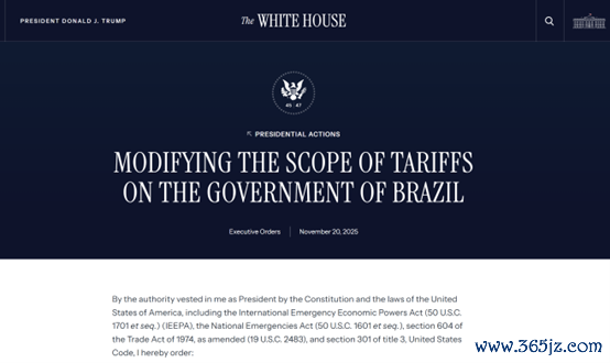 部分商品40%从价关税维持不变,但鉴于谈判取得进展,对美东时间11月13日零点后进入美国的特定巴西农产品取消附加从价关税。