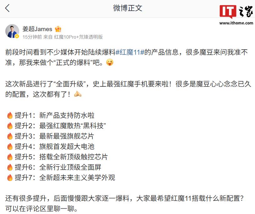 IT之家注意到,红魔游戏手机产品总经理姜超 9 月 4 日“正式爆料”红魔 11 手机,称这次新品进行了全面升级,是“史上最强红魔手机”,很多用户心心念念已久的配置这次都有了。